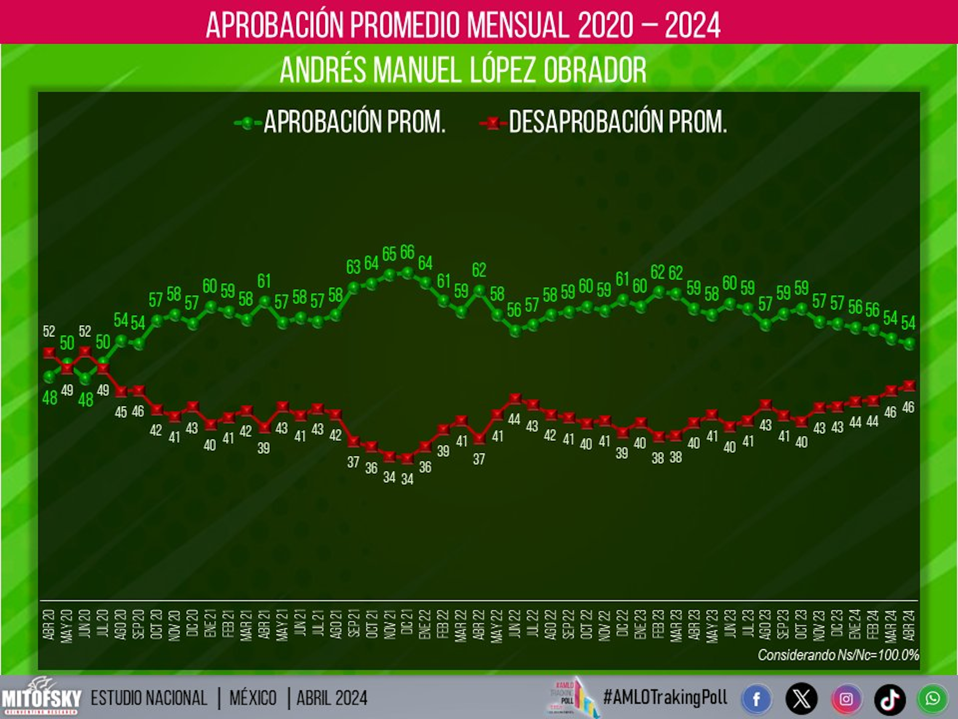 Durante todo el período de gobierno, el presidente López Obrador gozó de una importante estabilidad en sus afectos populares, según la encuestadora Mitofski. A partir de esos altos niveles de popularidad, logró realizar un endoso total a su candidata, Sheinbaum, y a su partido, Morena.