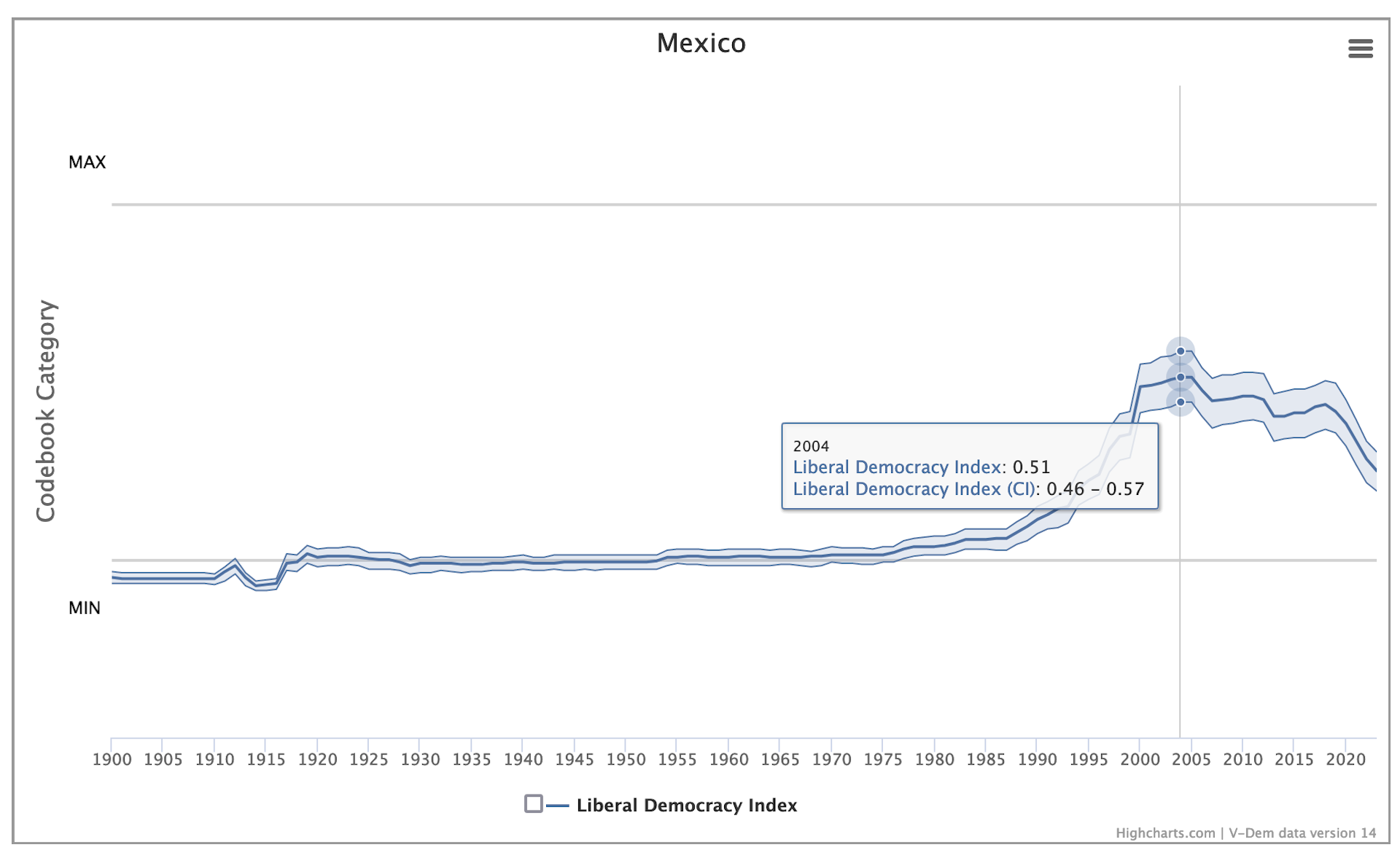 La calidad democrática, según datos V-DEM del índice de democracia liberal en México, llegó a su techo tras la alternancia del año 2000, durante el gobierno de Vicente Fox. Sin embargo, a partir de allí, el indicador ha venido mermando.