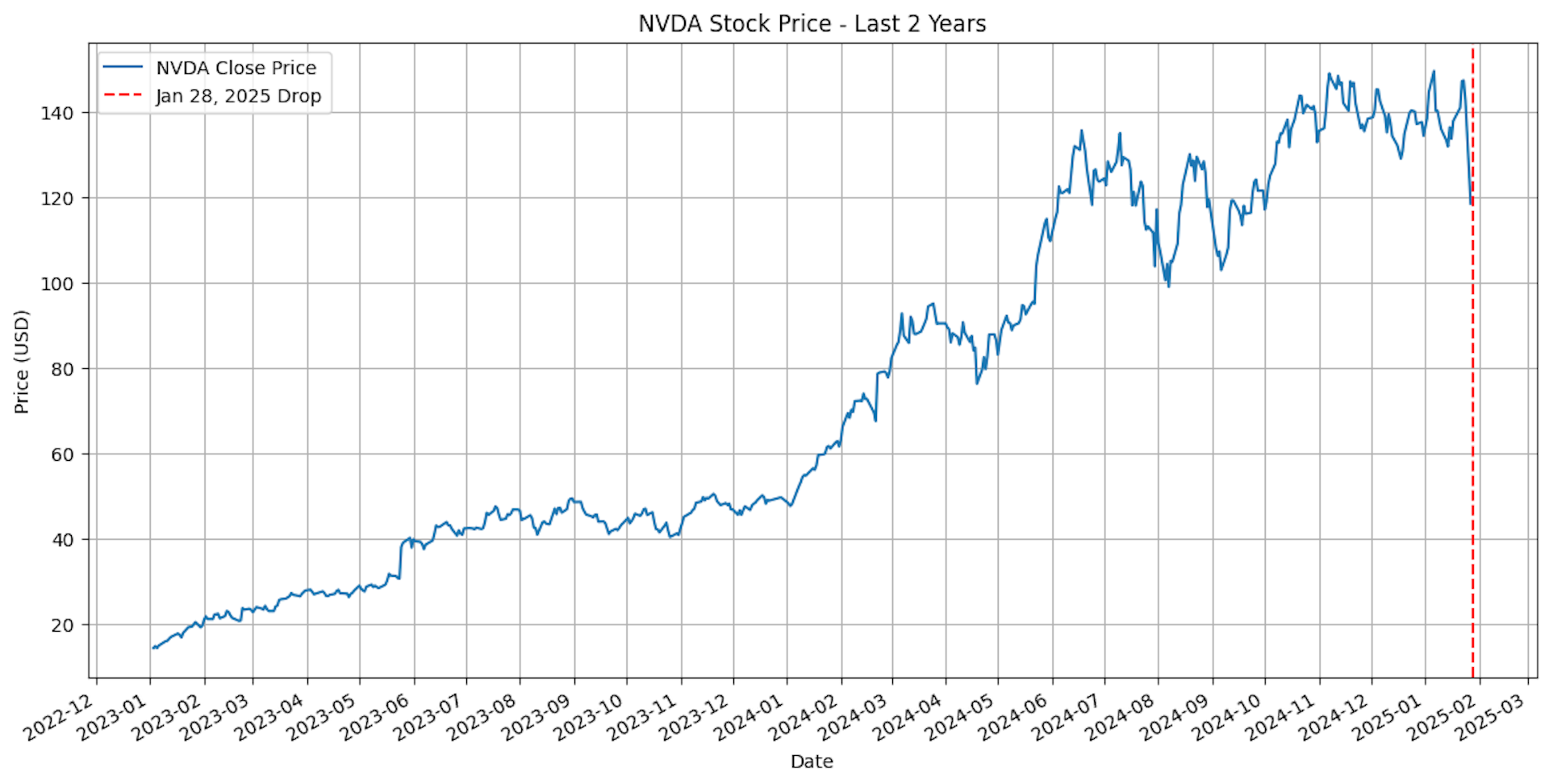 3. 27 de enero de 2025: la línea roja punteada vertical marca la fecha de lanzamiento de la plataforma de IA china DeepSeek. Se ve claramente su impacto en el valor de mercado de Nvidia (NVDA). La caída en el precio de las acciones eliminó aproximadamente 600 000 millones de dólares de su capitalización bursátil. Al cierre de la jornada, el precio se situó en 118,42 dólares, 24,10 menos (16,90 %) que al inicio de la jornada.